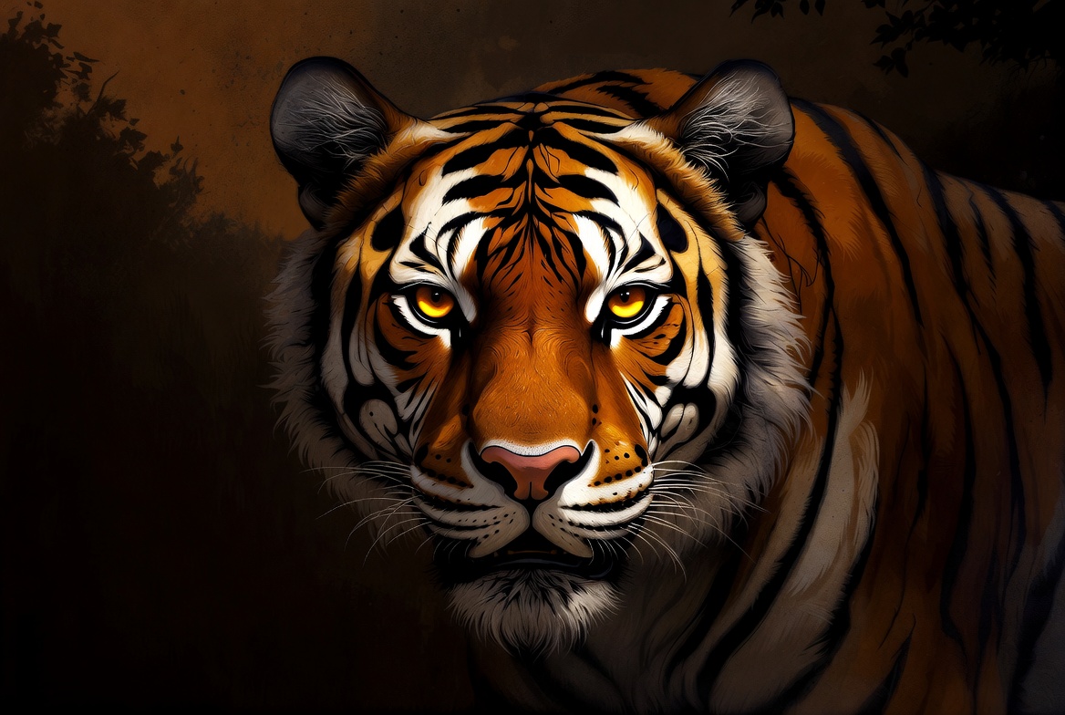 animal portrait, big cat, black stripes, close-up, dark background, digital art, fierce tiger, forest backdrop, illustration, intense gaze, jungle animal, mammal, orange fur, predator, realistic illustration, snarling tiger, striped tiger, tiger face, whiskers, wild animal, wildlife, yellow eyes, tiger