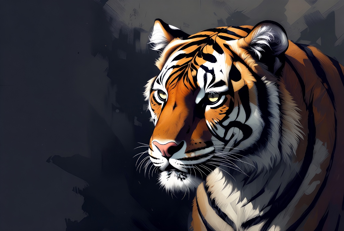 A detailed digital illustration of a tiger's face with striking orange fur and black stripes. The tiger gazes forward with intense yellow eyes and whiskers protruding from its pink nose. It is set against a dark, textured background with dramatic lighting.