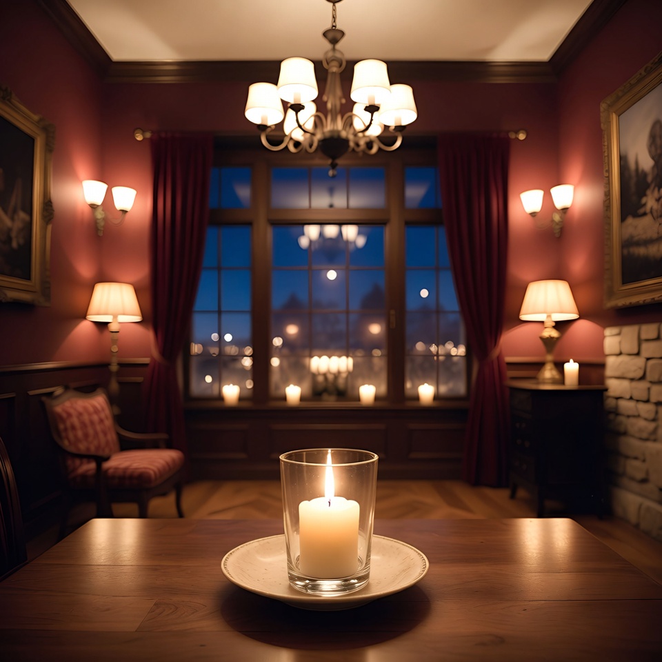 atmospheric lighting, bokeh effect, burning candle, candlelight, chandelier, city lights, cozy room, dimly lit room, elegant dining, evening ambiance, glass candle, interior decor, lamps, large window, luxury interior, maroon curtains, night view, red armchair, romantic setting, soft glow, warm lighting, white plate, window view, wooden floor, wooden table, candle