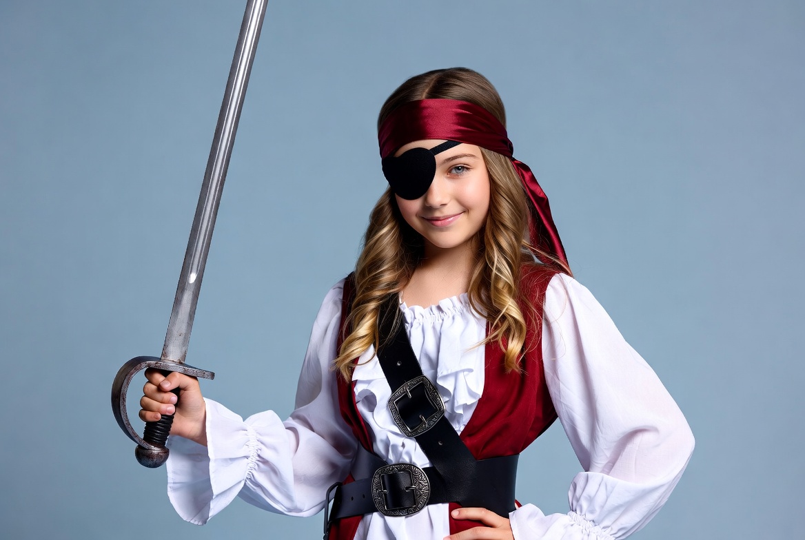 A young girl with long wavy brown hair wears a pirate costume featuring a red bandana, black eye patch, white blouse, red vest, and black belt. She holds a silver sword in her right hand and stands confidently against a plain blue background. Her expression is playful with a slight smile.