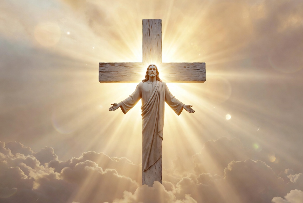 Jesus Christ stands crucified on a large wooden cross against a heavenly sky filled with golden rays of light and clouds. He wears a white robe with arms outstretched and long hair and beard. The scene features dramatic sunlight beams radiating from behind the cross.