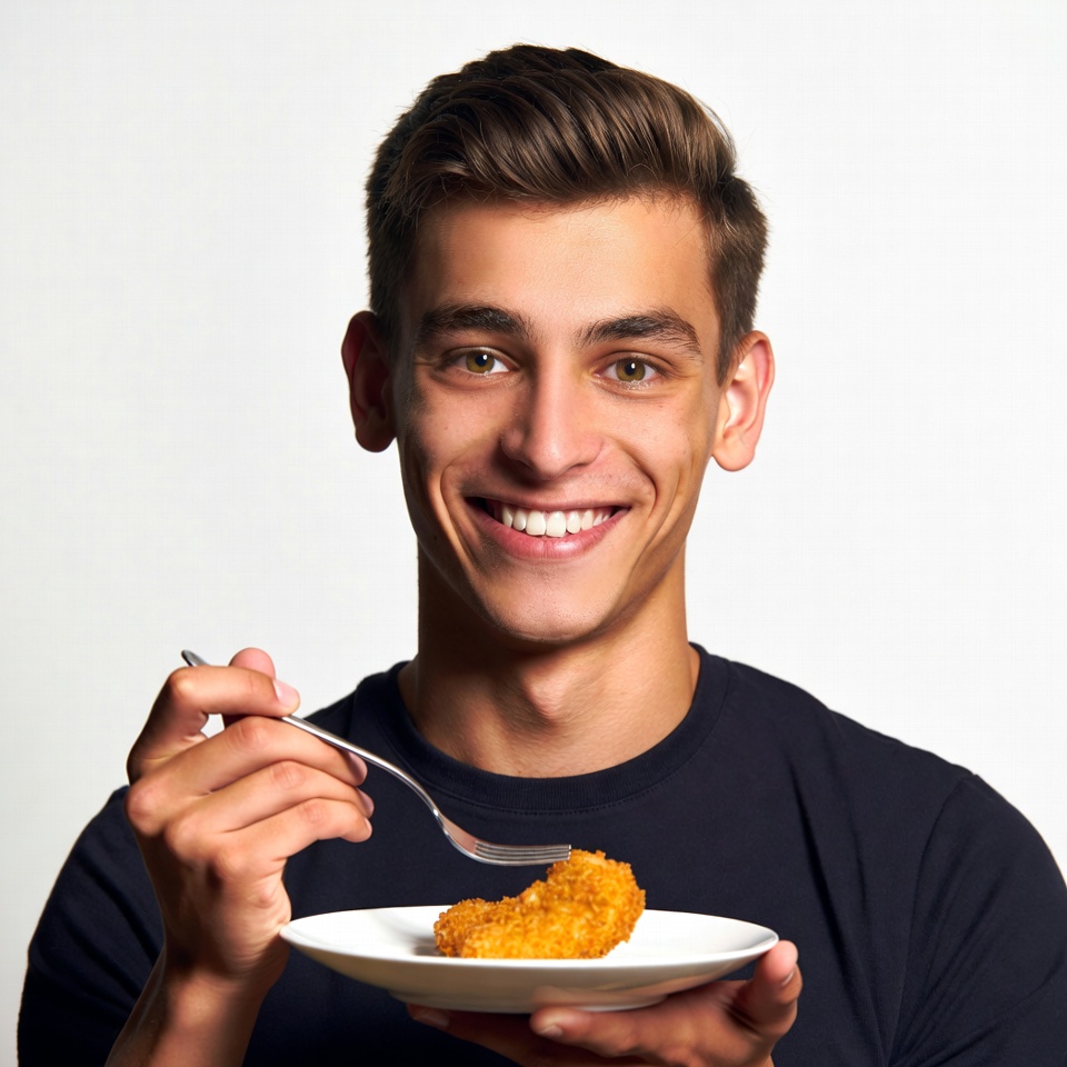 A young man with short brown hair smiles while holding a white plate with a piece of golden fried chicken. He uses a fork to pick up the chicken, wearing a black t-shirt. The image is set against a plain white background.