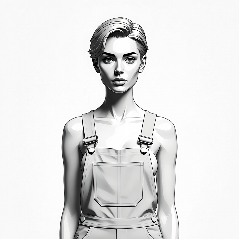 White, artistic rendering, bare shoulders, blonde hair, confident pose, denim overalls, detailed face, digital art, female, front view, grayscale, illustration, overalls, portrait, short hair, sleeveless, striking eyes, white background, young woman, woman