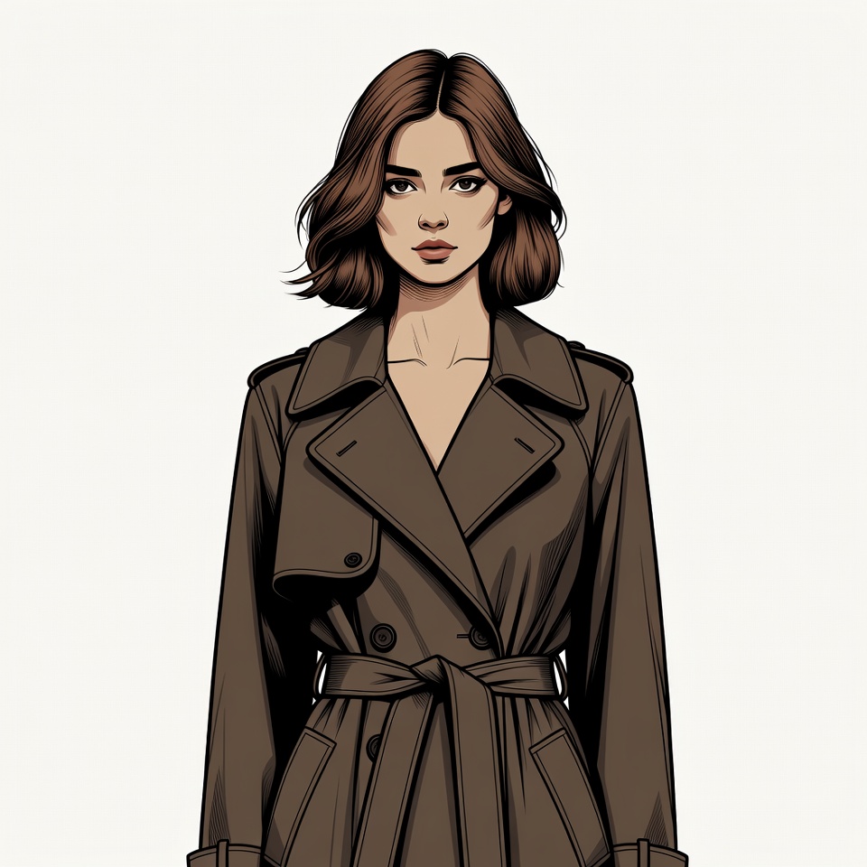 An illustration of a woman with wavy brown hair and subtle makeup stands confidently wearing a belted brown trench coat. The coat features a double-breasted design with a deep V-neckline and is depicted on an isolated white background. Her expression is calm and direct, gazing forward.