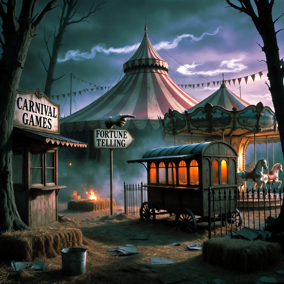 abandoned fair, campfire, carnival games, carousel horses, circus tent, clipart, creepy atmosphere, dark forest, fog mist, fortune telling, glowing lights, haunted fairground, hay bales, illustration, night scene, stormy sky, striped tents, twisted trees, wooden signs, spooky carnival