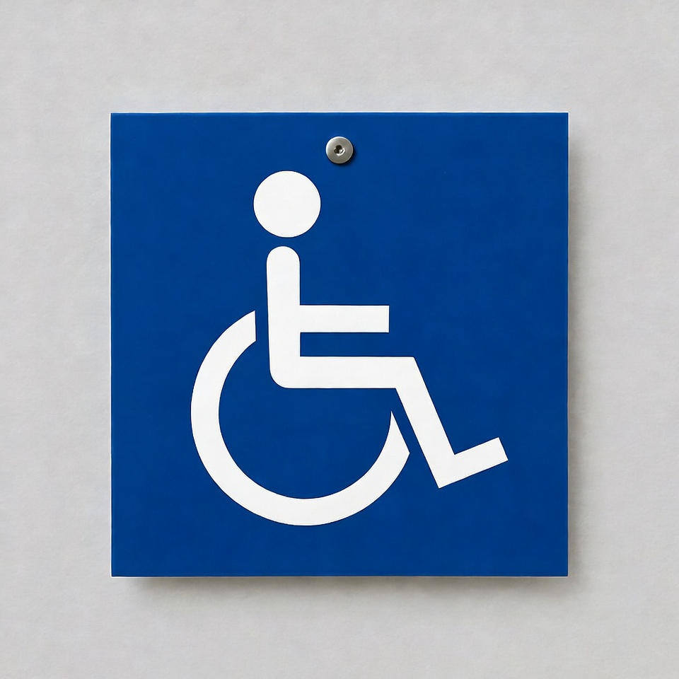 ADA sign, accessibility symbol, accessible entrance, blue sign, disability symbol, disabled access, gray wall, handicap parking, icon sign, mounted sign, parking sign, universal symbol, wheelchair person, white icon, wheelchair sign