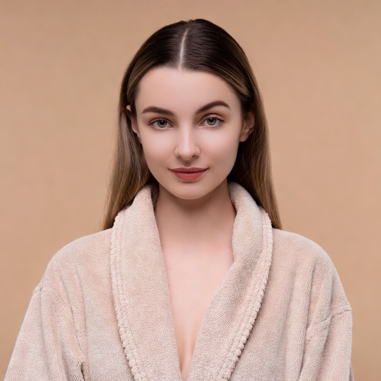 A young woman with long straight brown hair and green eyes gazes at the camera. She wears a fluffy beige bathrobe with a deep V-neckline. The image features a plain beige background.
