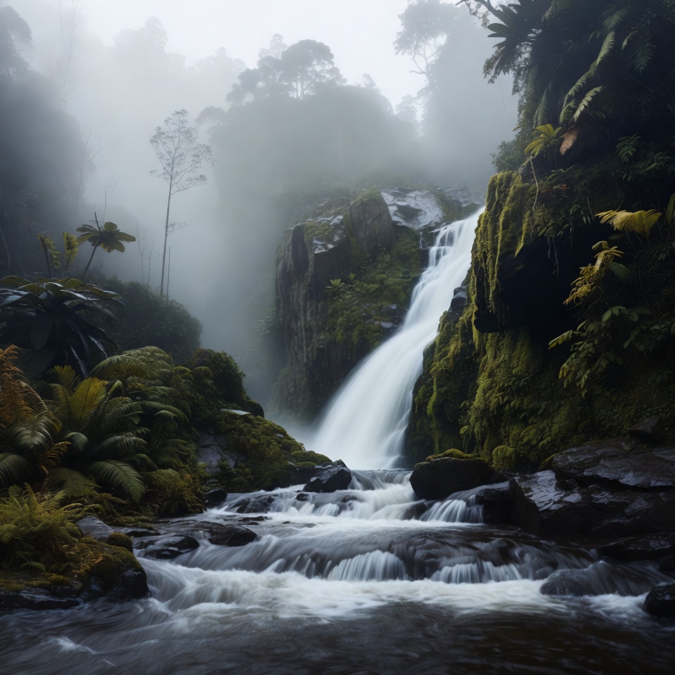cascade, ferns, fog, jungle, lush greenery, misty, misty forest, moss, nature, rainforest, rocks, stream, trees, tropical forest, tropical waterfall, waterfall cascade, waterfall
