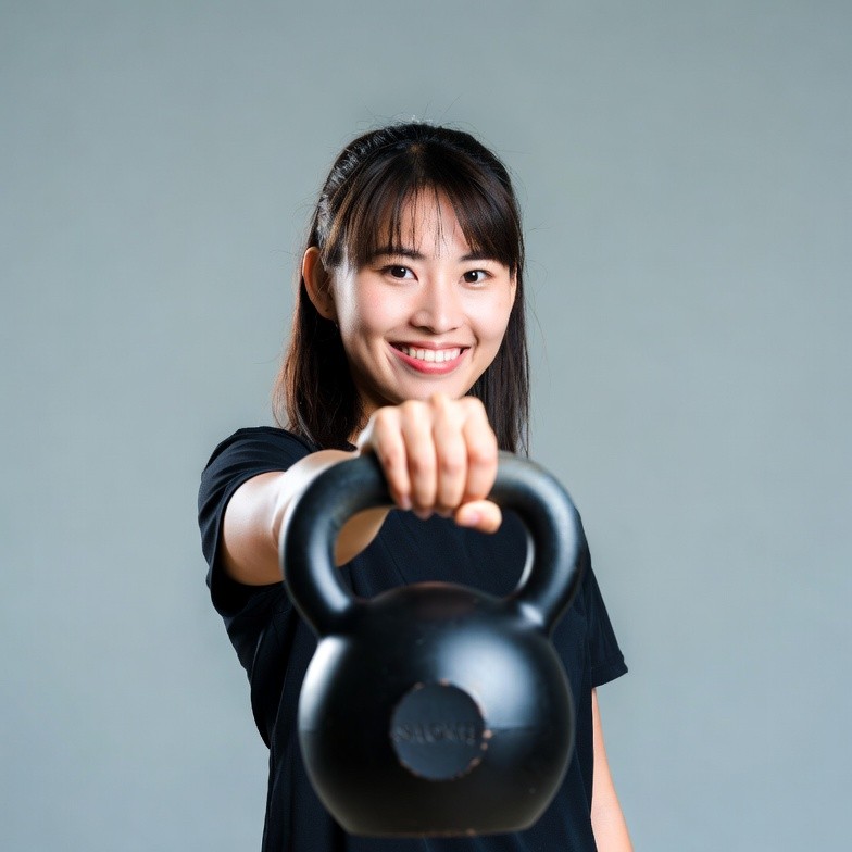 A young Asian woman with straight black hair smiles confidently while holding a black kettlebell in front of her chest. She wears a black t-shirt and stands against a plain gray background. Her pose suggests strength and fitness.