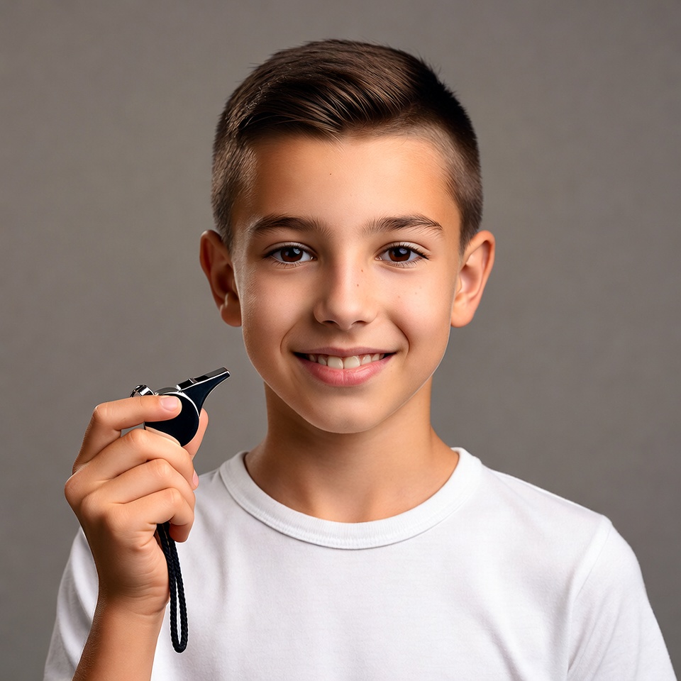 A young boy with short brown hair smiles at the camera while holding a black whistle in his right hand. He wears a plain white t-shirt and stands against a solid gray background. His expression is cheerful with bright eyes and a wide smile.