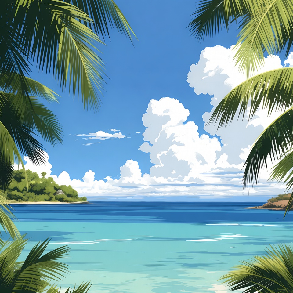 A vibrant illustration of a turquoise ocean beach framed by lush green palm tree fronds. Fluffy white clouds float in a bright blue sky above distant green hills and rocky shores. The serene tropical scene features clear blue water meeting the sandy beach.