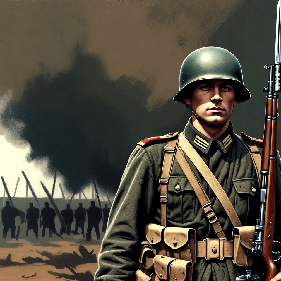 A stern German soldier in a green uniform and helmet stands at attention holding a rifle. He wears red epaulets, ammo pouches, and shoulder straps with a blurred background of fellow soldiers and barbed wire. The scene features a smoky, battlefield atmosphere with distant figures.