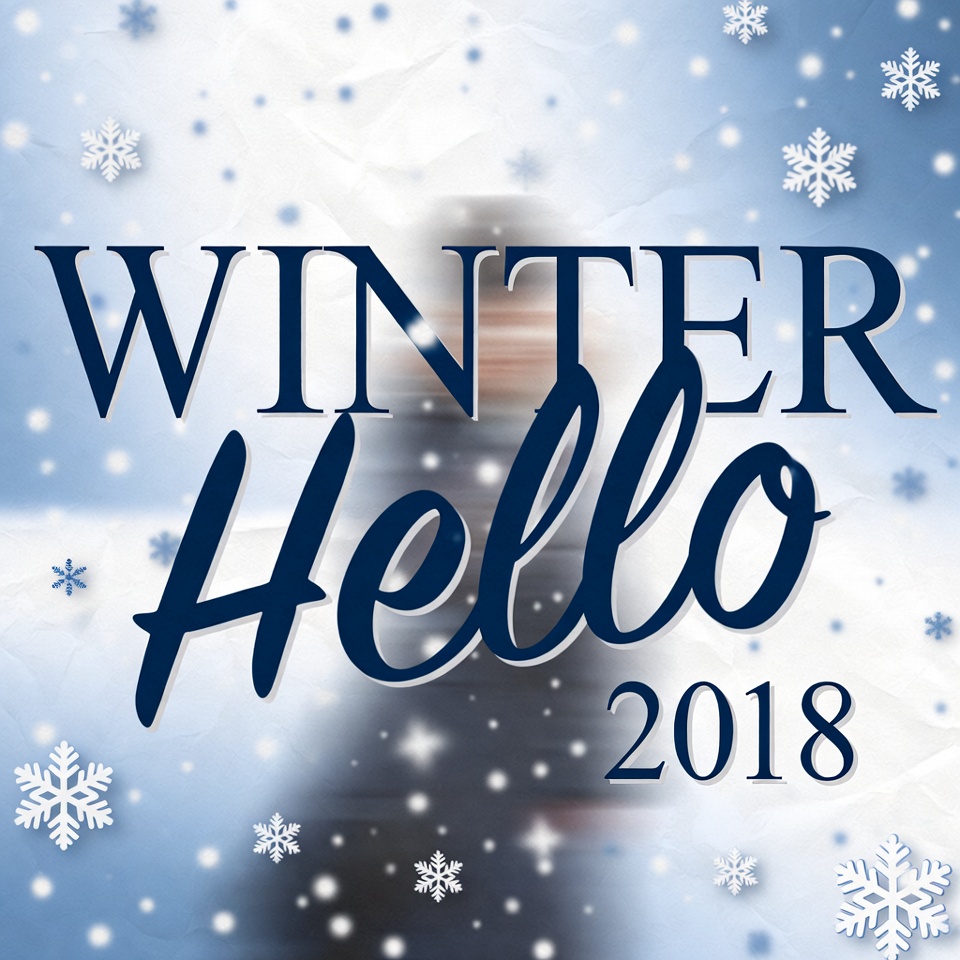 A graphic design features the words 'Winter Hello 2018' in elegant navy blue cursive font on a snowy blue background. Scattered white snowflakes and subtle snow texture enhance the winter theme. The text is prominently centered with a festive, holiday appearance.