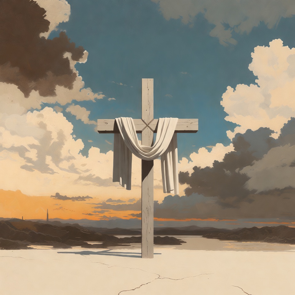 christian cross, clouds, clouds background, dramatic sky, draped cloth, hills, horizon, illustration, isolated background, religious symbol, sky, snowy landscape, sunset, water, white cloth, wooden cross, cross