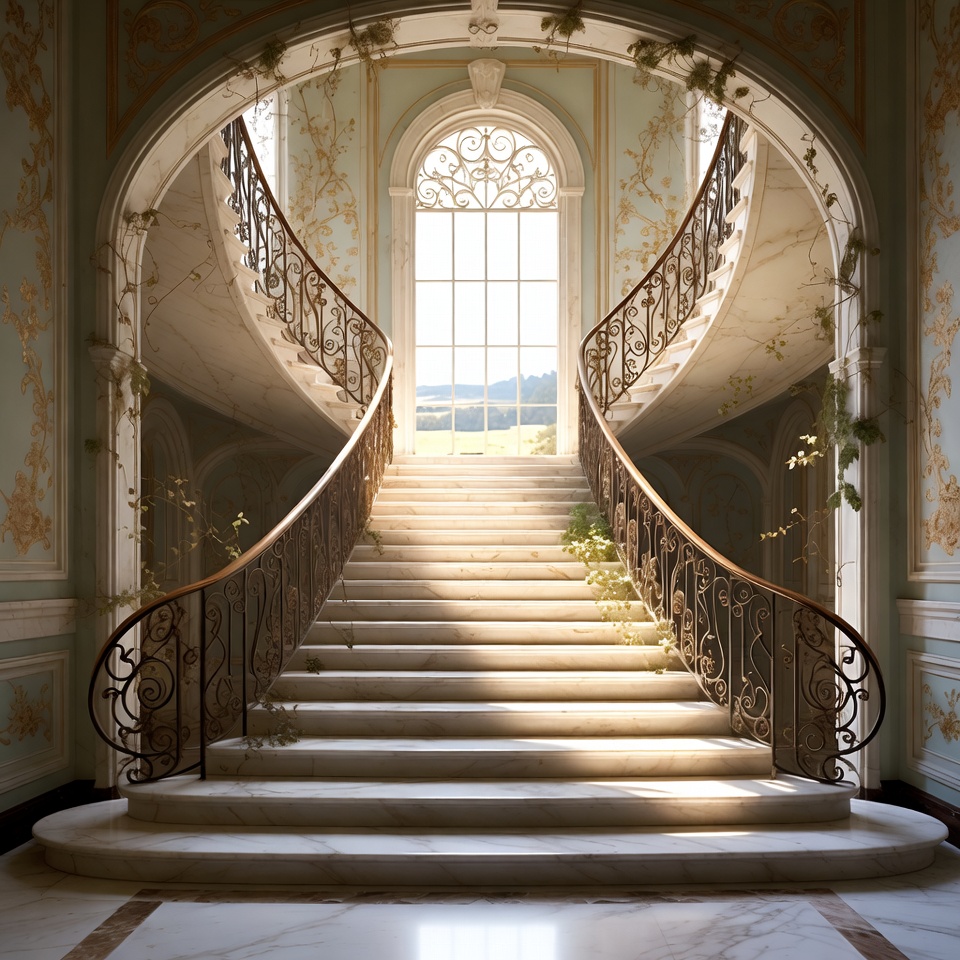 arched window, baroque architecture, chateau stairs, double helix stairs, elegant interior, empty hallway, fields landscape, gold patterns, grand staircase, green walls, historic mansion, isolated background, ivy plants, light rays, luxury architecture, mansion interior, marble floor, ornate railings, palatial hallway, rococo design, spiral stairs, sunlight, vines, window view, staircase