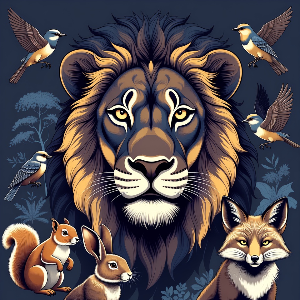 A majestic lion with a flowing mane faces forward in a detailed illustration surrounded by flying birds, a fox, squirrel, and rabbit. The animals are depicted in vibrant colors against a dark, leafy background. Small trees and foliage add depth to the wildlife scene.