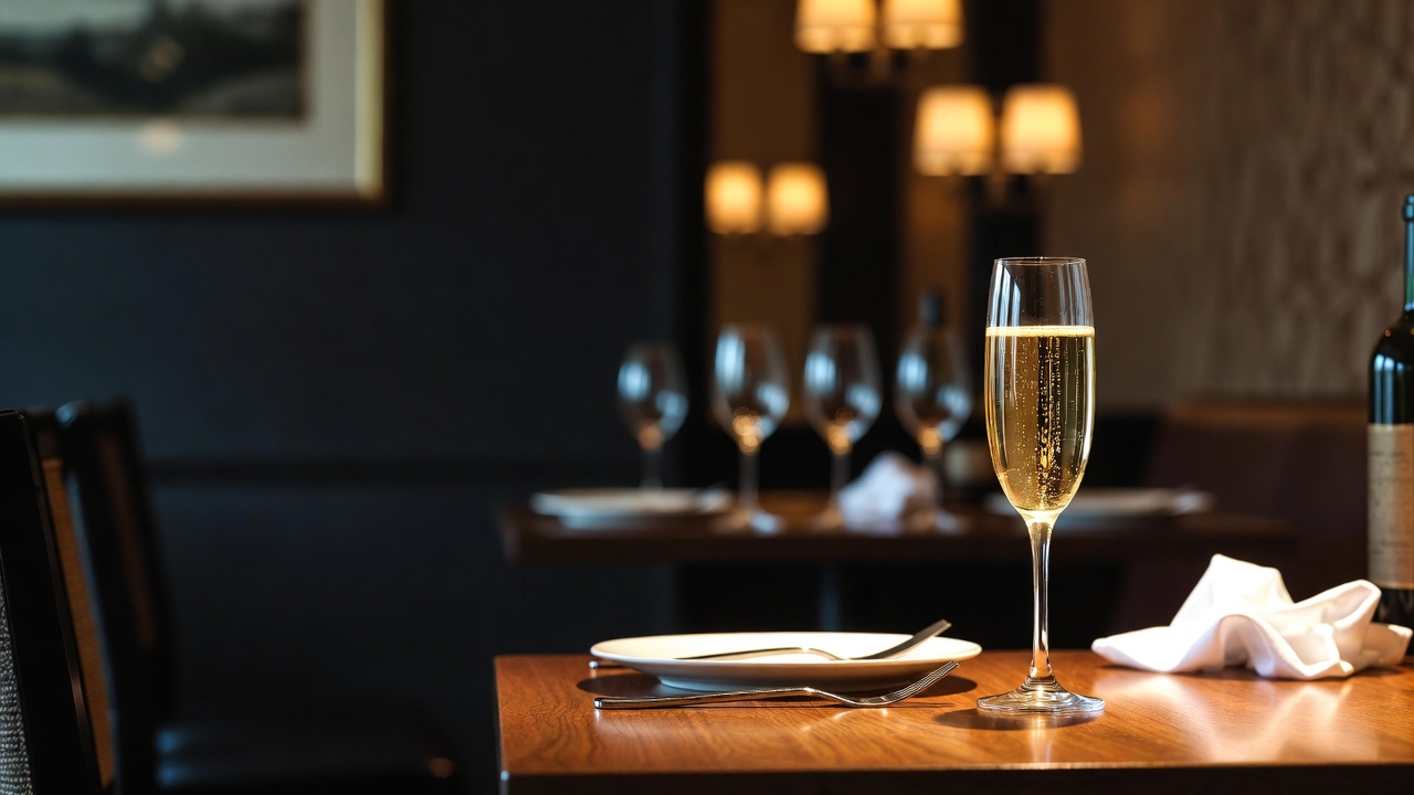 A tall champagne flute filled with bubbling champagne sits on a wooden table in a dimly lit upscale restaurant. A wine bottle and white napkin are placed nearby, with blurred glasses and chairs in the background. Warm lamp lights and a framed painting add to the sophisticated ambiance.