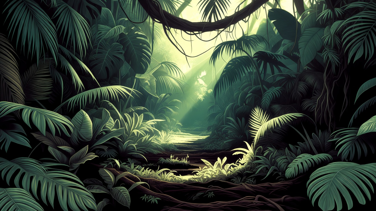artwork, canopy, clipart, dense foliage, dirt path, emerald green, exotic plants, ferns, forest, hanging vines, illustration, isolated background, leaves, lush greenery, nature scene, palm fronds, path, plants, rainforest, sunlight rays, trail, tropical plants, vines, wilderness, jungle