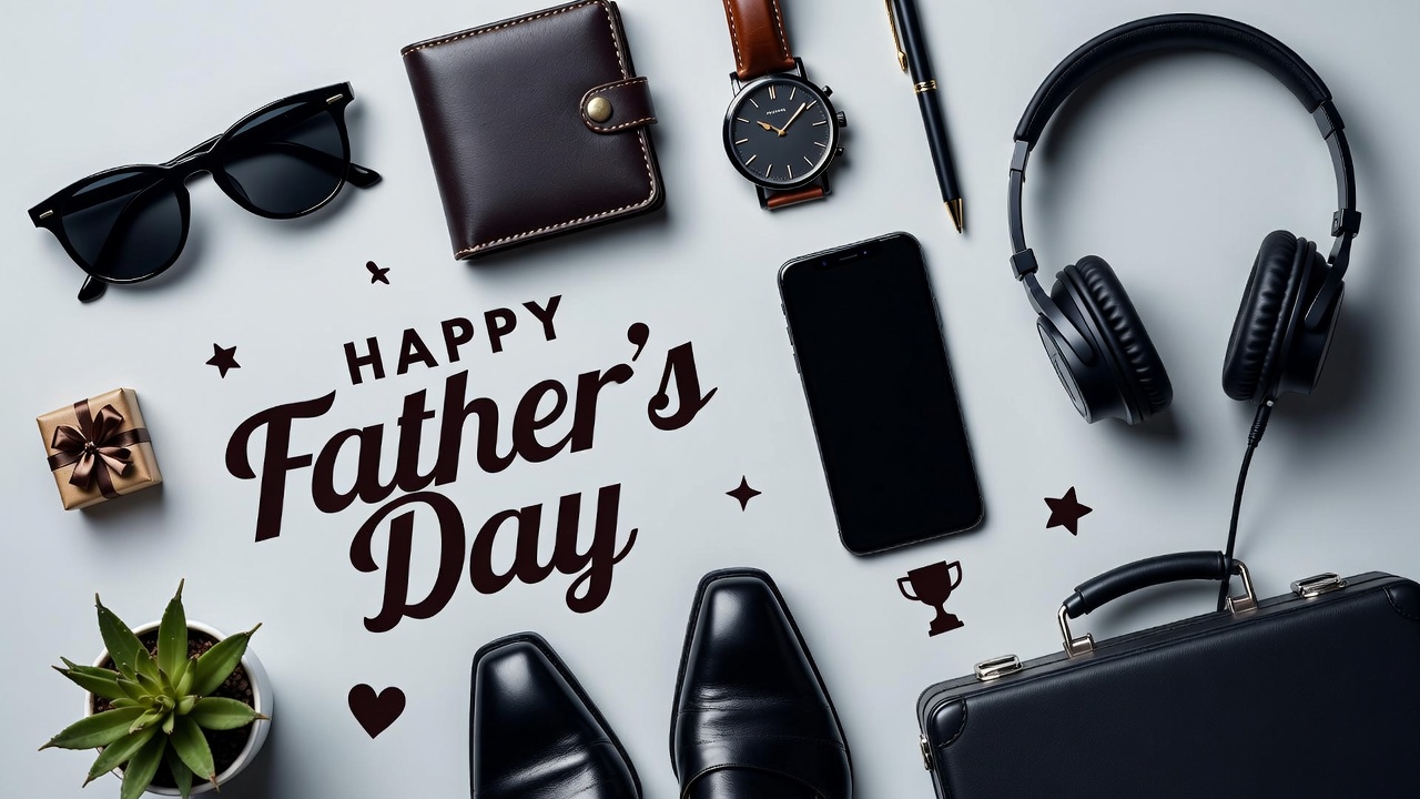 A flat lay composition on a white background features men's accessories for Father's Day. Items include black sunglasses, leather wallet, wristwatch, pen, headphones, smartphone, gift box, trophy, black dress shoes, briefcase, and potted plant. Bold 'Happy Father's Day' text with stars and heart decorates the center.