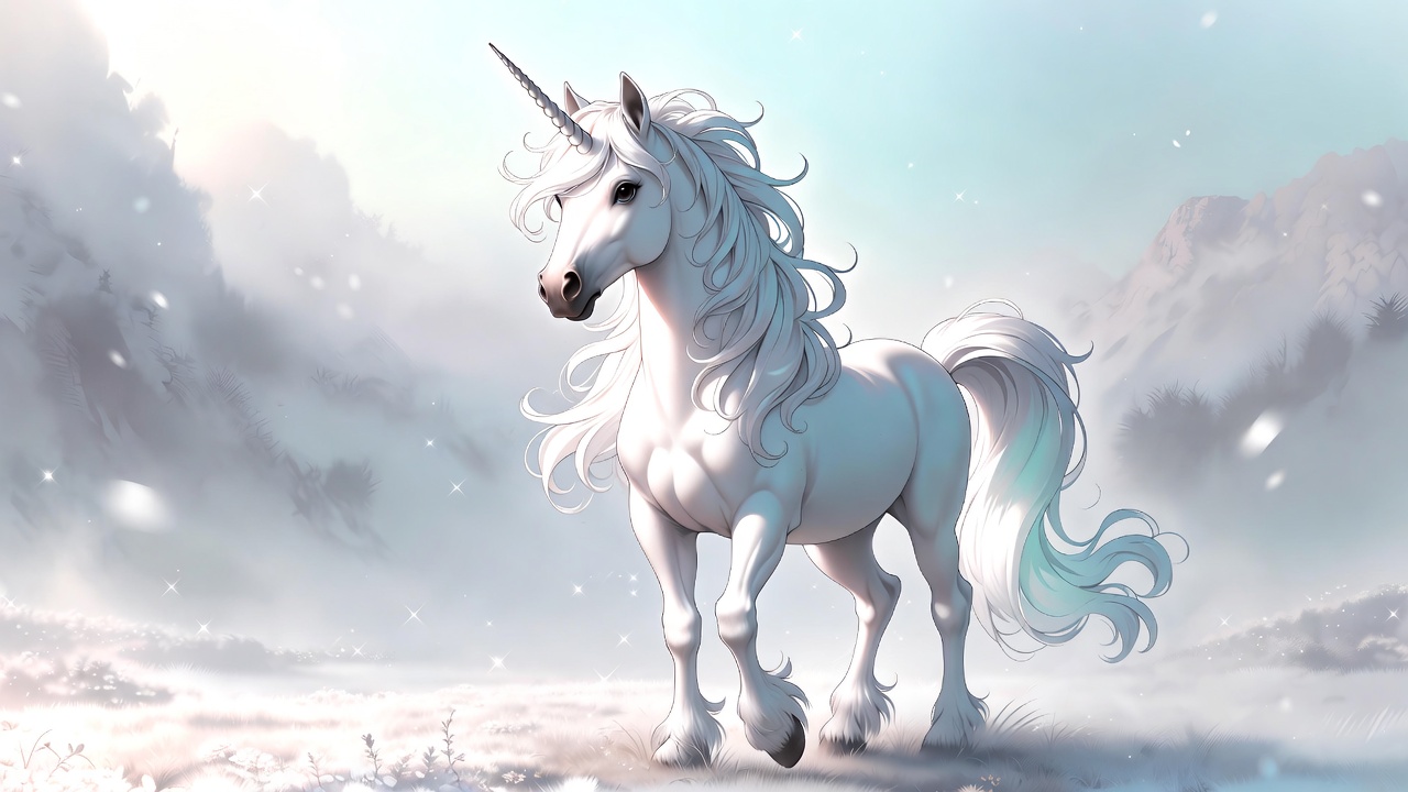 A majestic white unicorn with a flowing mane and horn stands in a snowy landscape. Snowflakes fall around it against a backdrop of mountains and cloudy skies. The digital illustration features soft lighting and ethereal details.