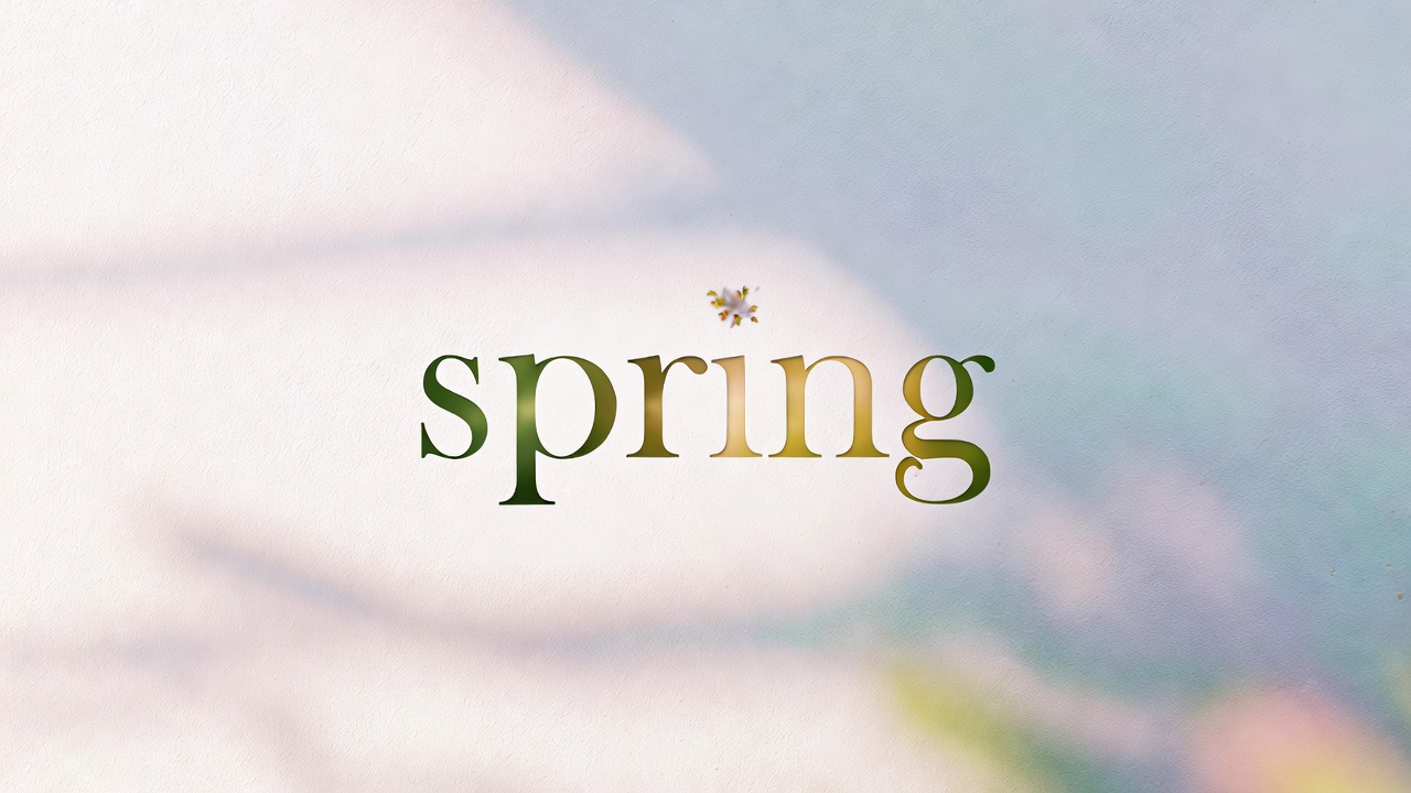 The word 'Spring' is written in elegant gold letters on a soft pastel background with light shadows. A small yellow flower sits above the text. The design features a blurred, serene backdrop in pink and green tones.