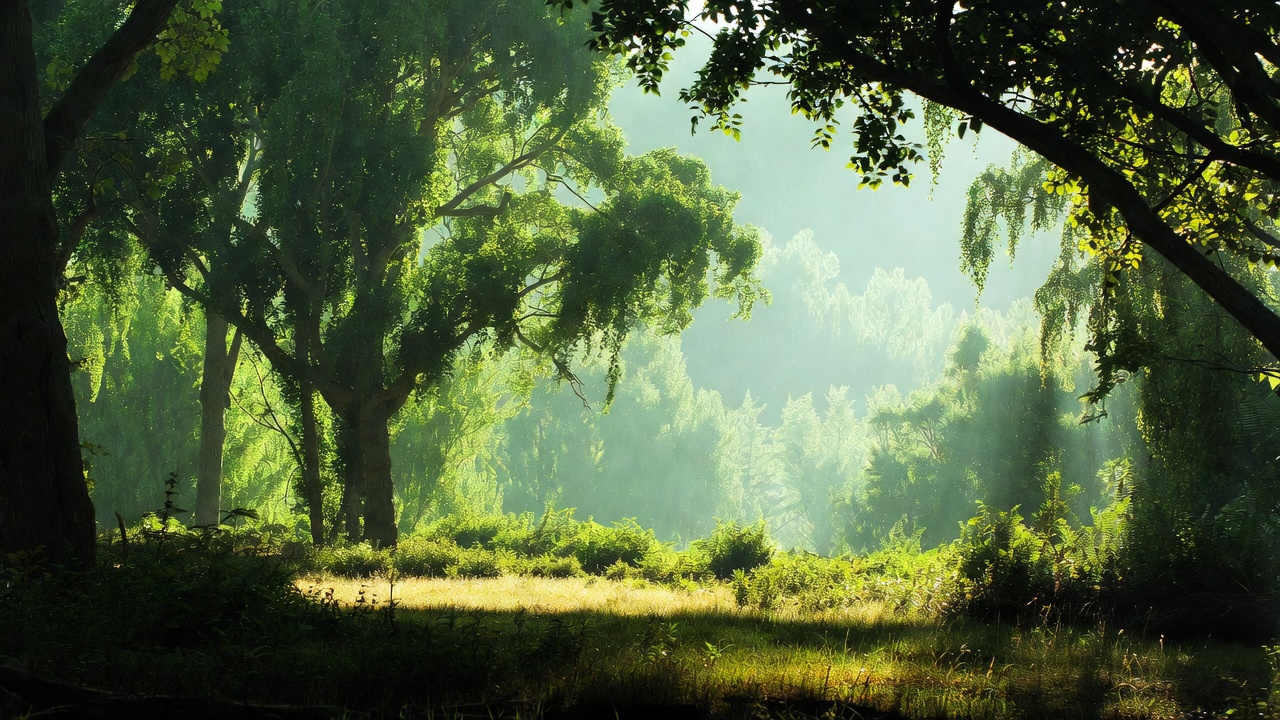 A serene forest clearing bathed in soft sunlight filters through dense green tree canopies. Tall trees with hanging branches frame the scene, creating a natural archway. The ground is covered in grass and underbrush, with mist adding depth to the background woods.