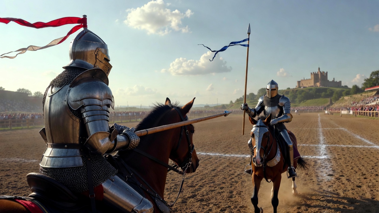 Two armored knights in shining silver and gold plate armor ride brown horses toward each other on a sandy jousting field. They hold long wooden lances with red and blue flags streaming from their helmets. A medieval castle stands on a hill in the background under a partly cloudy sky.