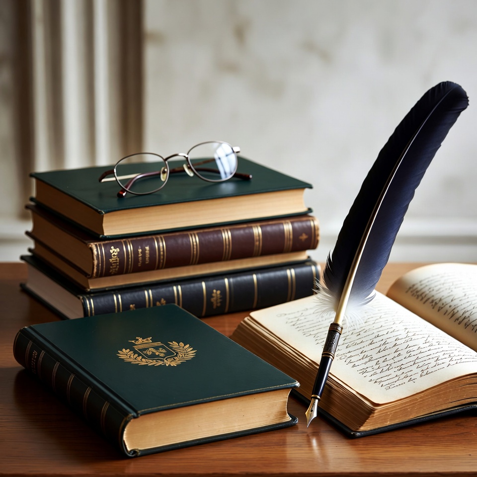A stack of leather-bound antique books sits on a wooden table. A black feather quill pen rests beside an open book with handwritten pages. Round wire-rimmed glasses are placed on top of the books against a blurred classical background.