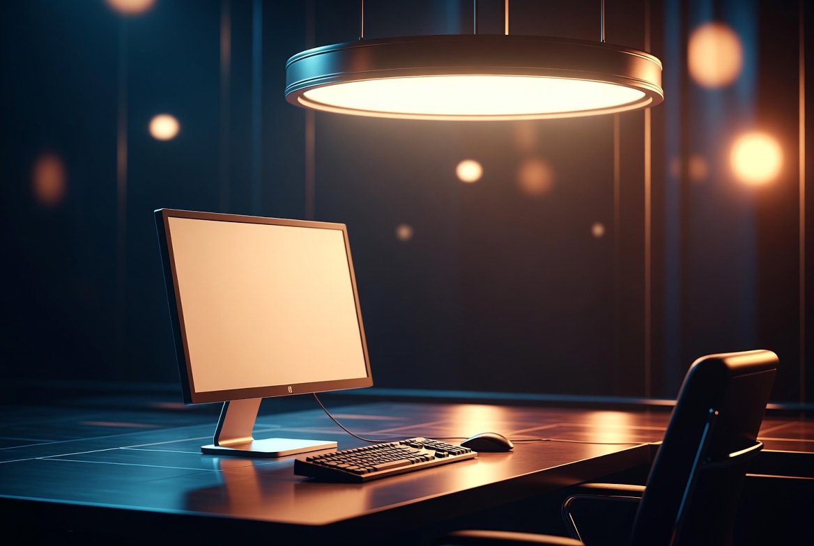 A sleek wooden desk holds a blank computer monitor, keyboard, and mouse in a dimly lit room. A large round ceiling lamp emits warm light from above, surrounded by floating light orbs. An empty office chair sits beside the setup against a dark background.