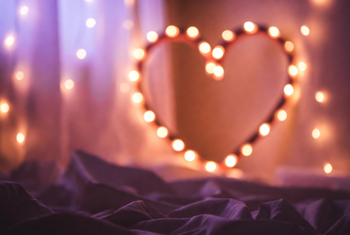 bed sheets, blurred background, bokeh effect, dark bedding, dreamy background, fairy lights, festive lights, glowing heart, heart garland, heart shape, holiday decor, illuminated heart, light bokeh, light decoration, love symbol, pink lights, purple curtain, purple fabric, romantic lights, soft lighting, string lights, twinkle lights, valentine lights, warm glow, heart lights