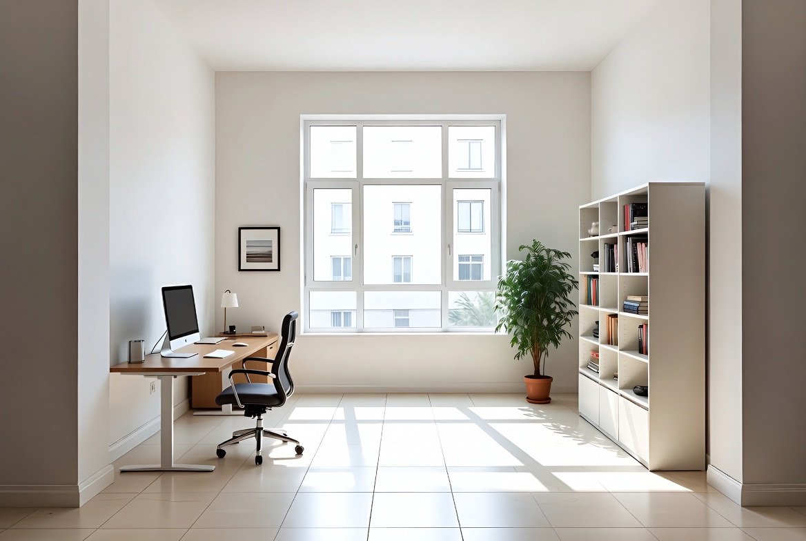 books, bookshelf, bright room, clean office, coffee mug, computer monitor, desk lamp, empty office, interior design, large window, minimalistic, modern office, natural light, office chair, office desk, potted plant, sunlight, white walls, wooden desk, workspace, home office
