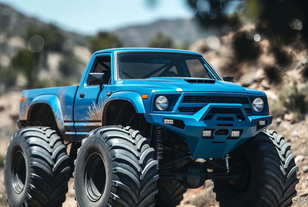 adventure vehicle, big tires, blue monster truck, blue truck, custom truck, desert landscape, dirt road, extreme truck, flared fenders, lifted truck, mountain background, mountain trail, off-road tires, off-road vehicle, oversized wheels, rocky terrain, rugged bumper, truck grille, monster truck
