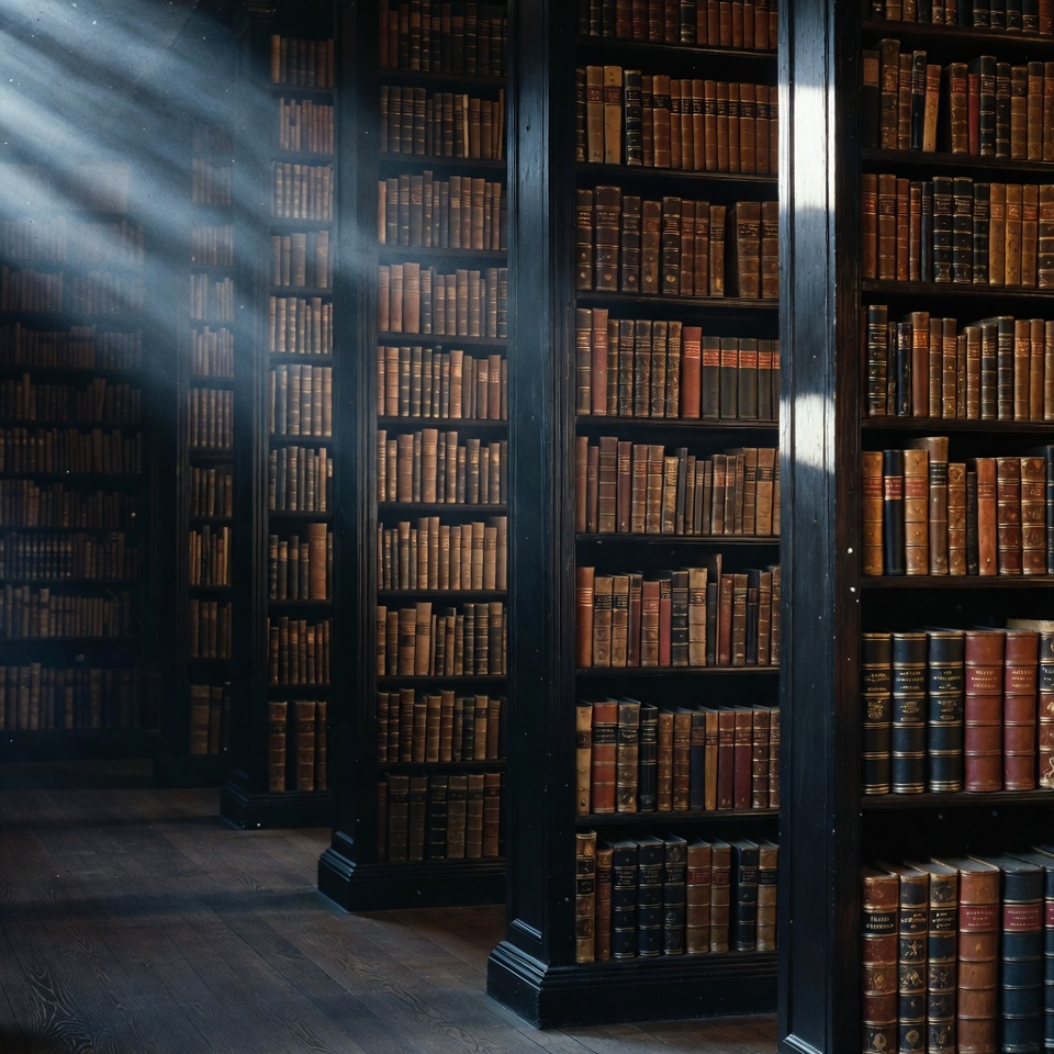 architecture, beam of light, book collection, book spines, books, books stacked, bookshelves, bookshelves lined, dark shelves, dramatic lighting, empty library, floorboards, grand library, historical library, interior, leather books, light rays, ornate shelves, quiet library, reading room, scholarly, sunbeams, sunlight, tall shelves, vintage books, window light, wooden floor, library