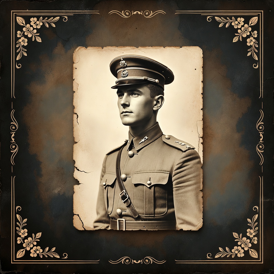 A young man in a sepia-toned vintage photograph wears a peaked cap and khaki military uniform with epaulettes and leather straps. He stands in profile view against a textured, aged paper background framed with ornate floral borders. The image has a distressed, antique photo effect.