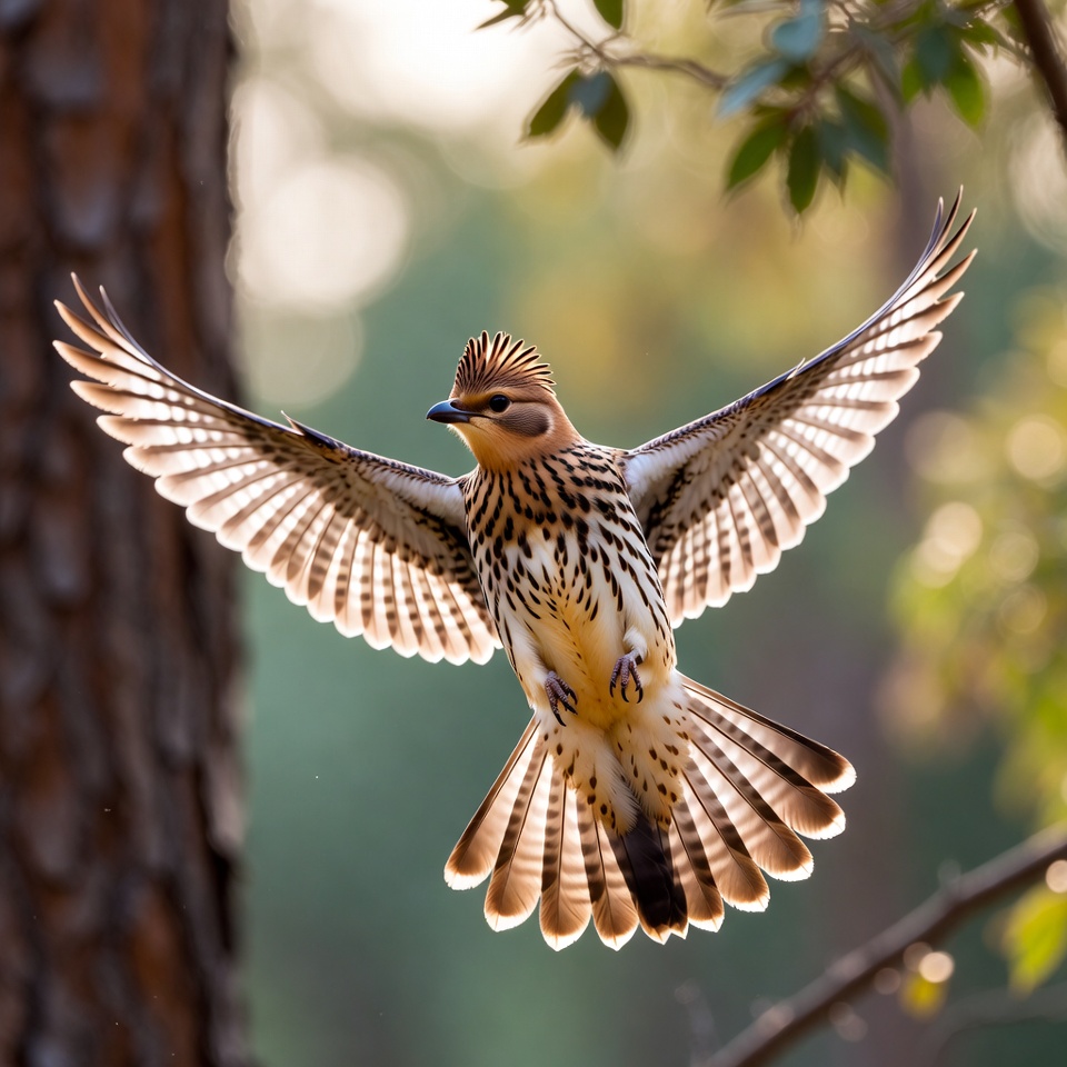 avian, barbet bird, bird crest, bird in flight, bird photography, feathers, flying bird, forest background, green trees, nature, ornithology, spotted feathers, wildlife, wings spread, yellow beak, crested barbet