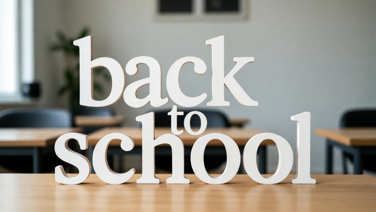 Large white 3D letters spelling 'Back to School' sit on a wooden desk in a classroom. Empty chairs and desks are arranged in rows behind it, with a green plant in the corner and a window nearby. The background features a plain wall with framed artwork.