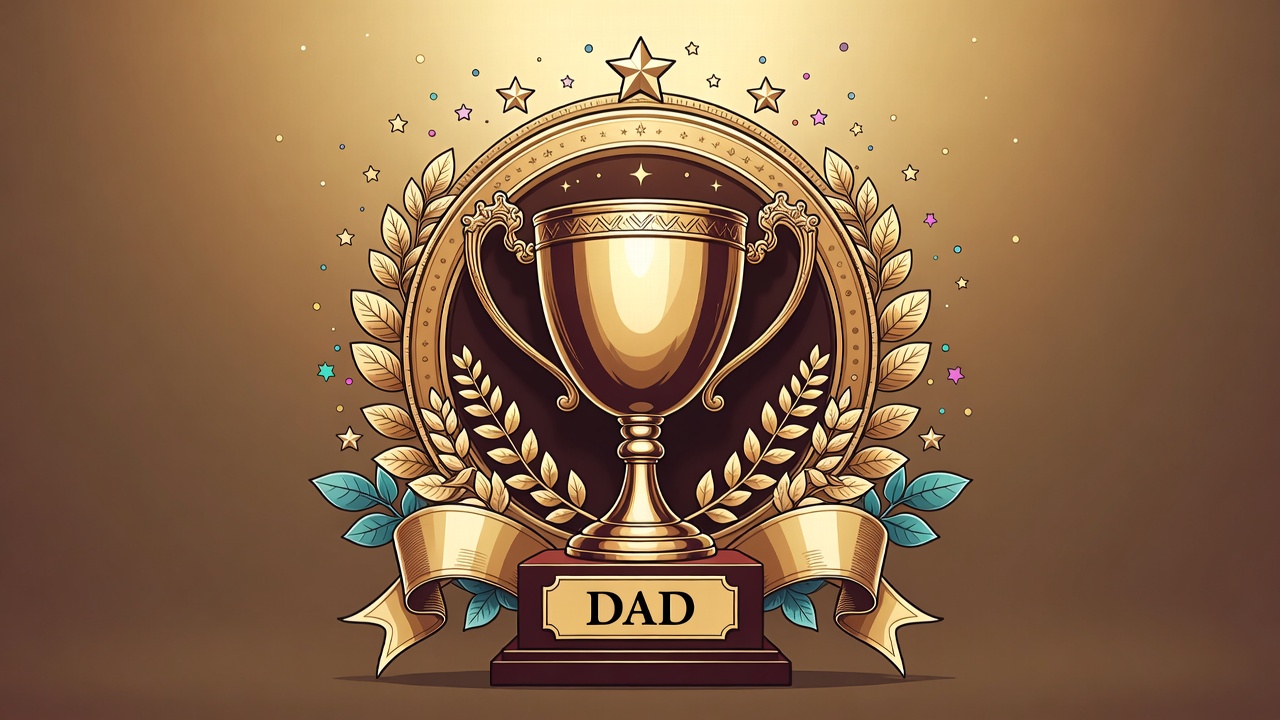 A golden trophy labeled 'DAD' stands on a base, encircled by laurel wreaths and colorful stars. Shiny ribbons and leaves decorate the ornate frame against a golden background. The design features a celebratory vector art style.