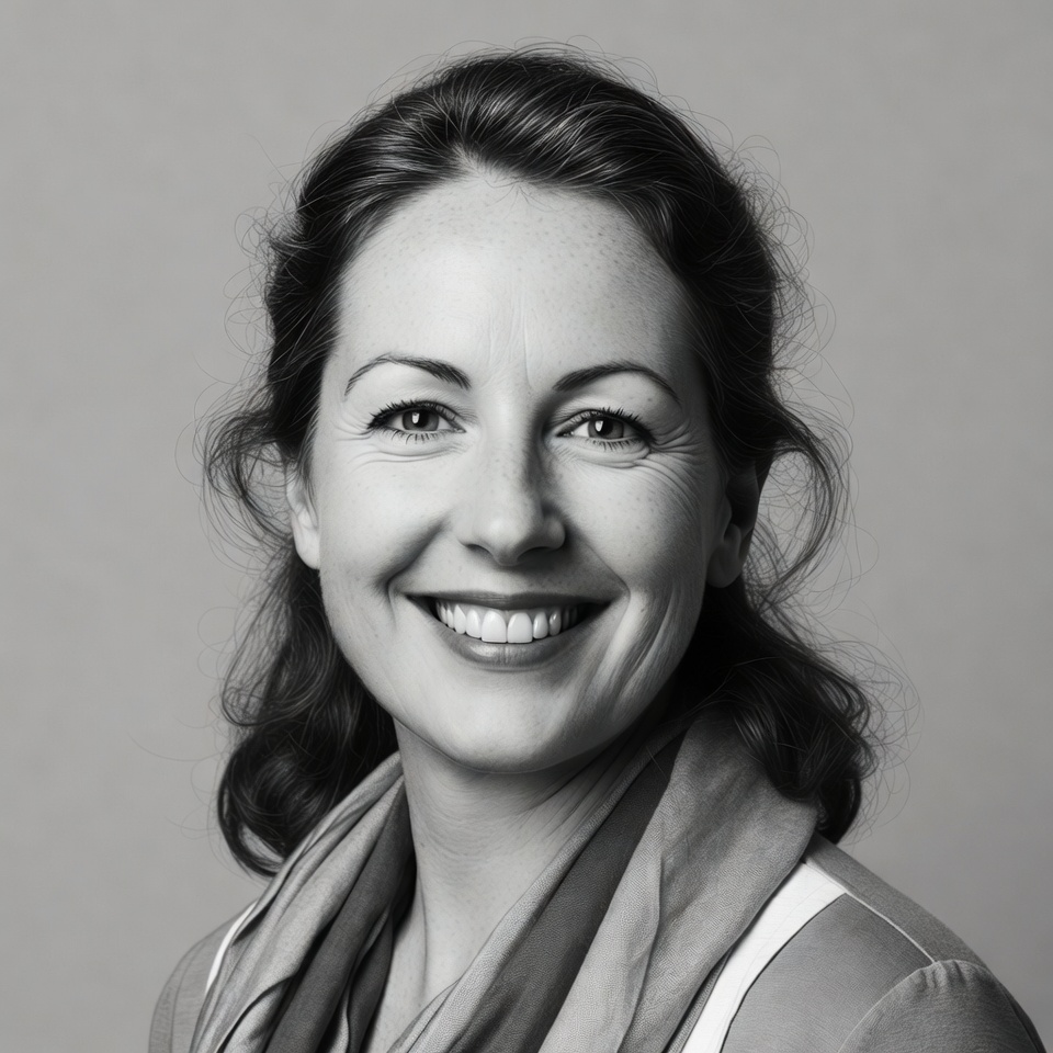 A woman with shoulder-length wavy dark hair smiles warmly at the camera in a black and white portrait. She wears a light-colored blouse and a draped scarf around her neck. Her eyes are expressive, and she has a gentle expression against a plain gray background.