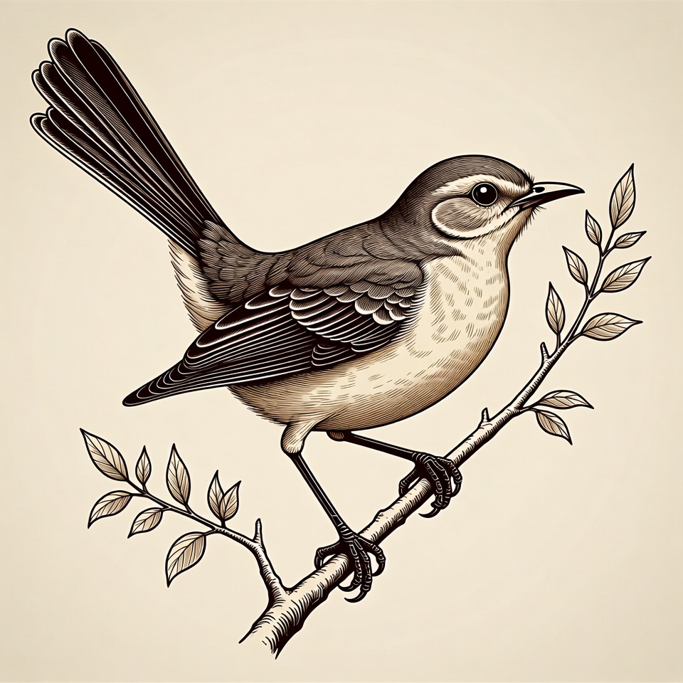 Mockingbird perched on branch illustration