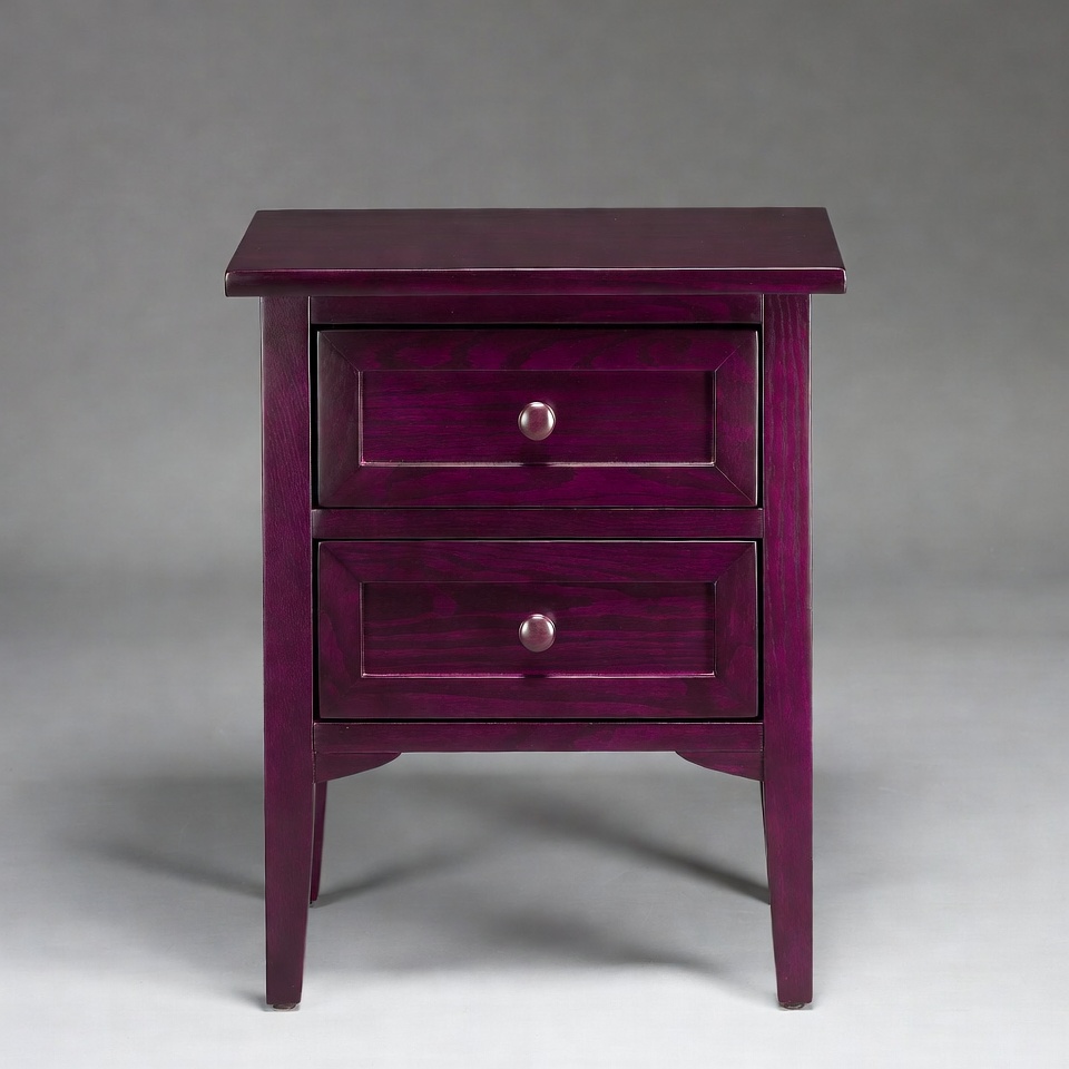 bedroom furniture, bedside table, drawers, end table, furniture, isolated background, knobs, legs, purple furniture, purple nightstand, two drawer nightstand, wood furniture, wooden nightstand, nightstand