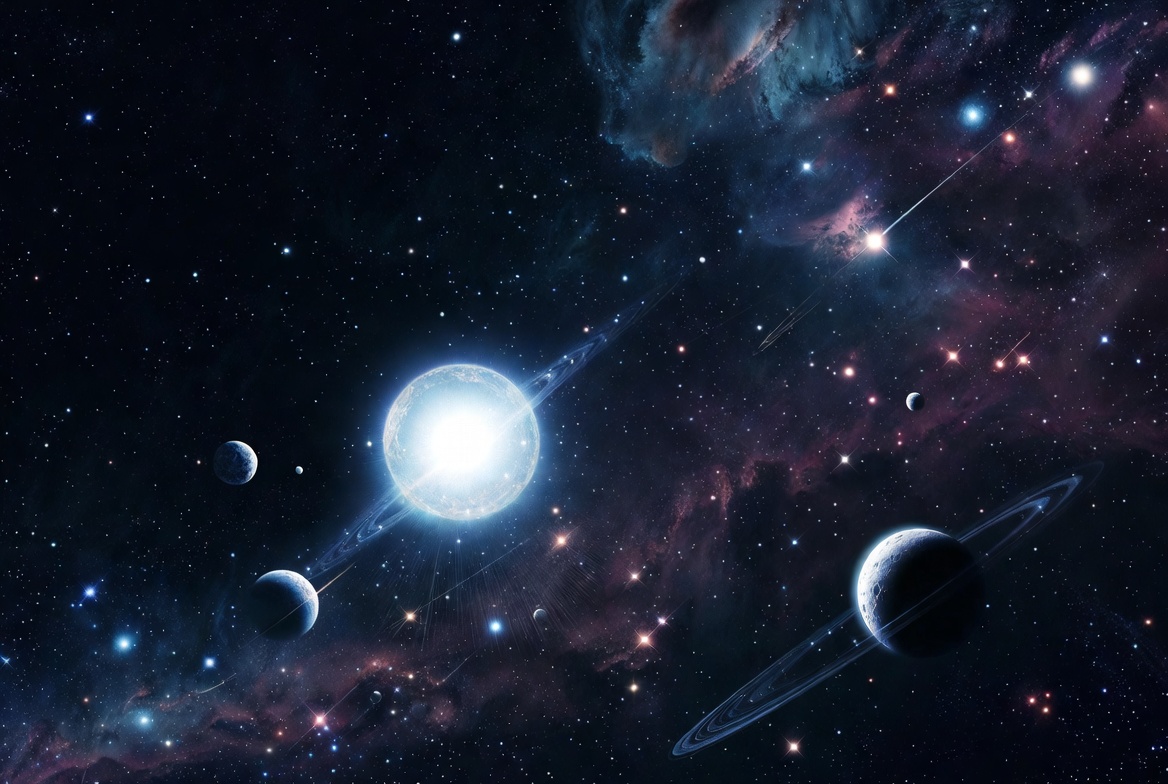 A vibrant cosmic scene features a glowing white star with radiating beams at the center. Several planets, including one with prominent rings like Saturn, orbit around it amidst colorful nebulae and scattered stars. The deep space background is filled with twinkling stars and cosmic dust.
