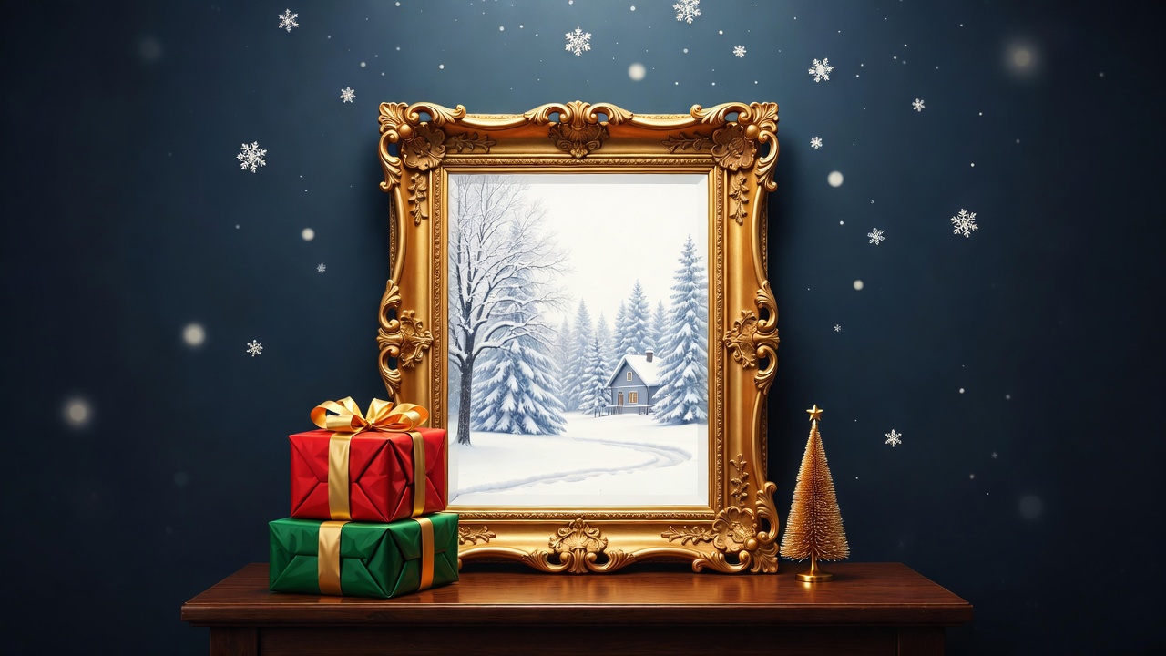 A gold ornate frame on a wooden table displays a painting of a snowy winter landscape with a small cabin, pine trees, and a snow-covered path. Red and green wrapped Christmas gifts sit beside the frame, accompanied by a gold star-topped tree. Snowflakes float against a dark blue background.