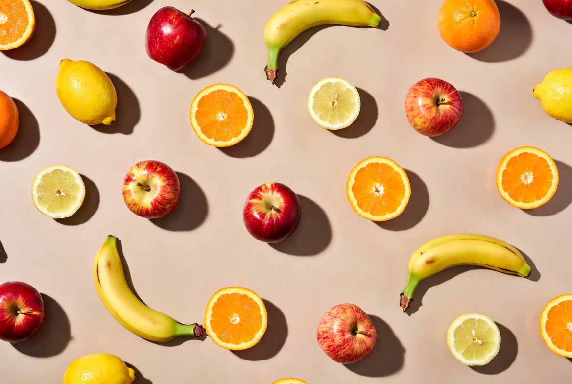 A flat lay arrangement features whole and sliced red apples, bananas, oranges, and lemons scattered across a neutral tan surface. The fruits display vibrant colors with natural shadows adding depth. Slices of oranges and lemons reveal juicy interiors.