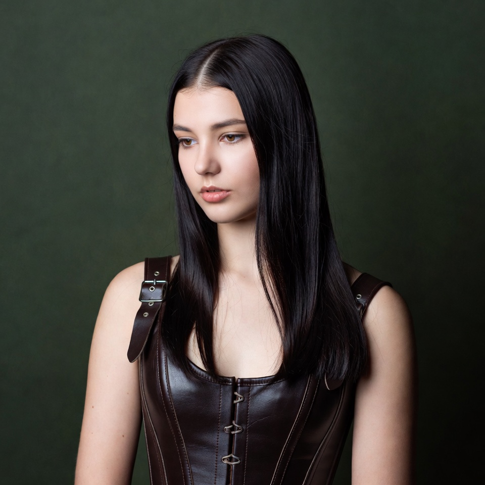 A young woman with long straight black hair stands against a dark green background. She wears a brown leather corset with shoulder straps and buckles. Her expression is pensive as she looks slightly to the side.