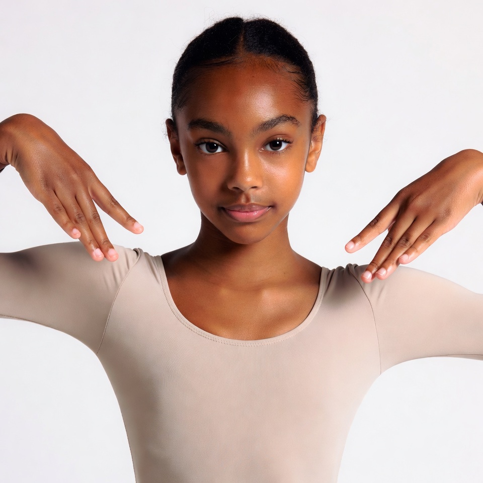 A young African-American girl stands in a ballet pose with arms extended and fingers pointed. She wears a beige long-sleeve leotard and has her hair in a neat bun. The image is isolated on a white background.