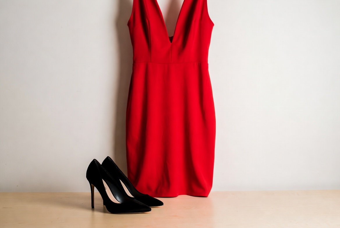 A vibrant red sleeveless dress with a deep V-neck hangs against a white background. Below it on a wooden surface sit a pair of black high-heeled stilettos. The outfit is displayed neatly for viewing.