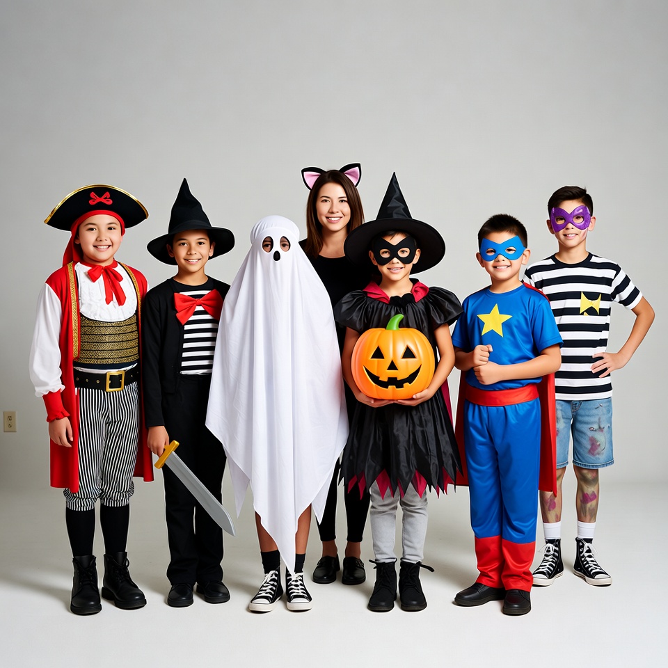 Asian, black dress, boy, cat ears, children, costumes, ghost sheet, girl, gray background, group, holiday, jack o lantern, kids, masks, pirate costume, pumpkin, spooky, striped shirt, superhero, swords, trick or treat, witch hat, woman, Halloween costumes