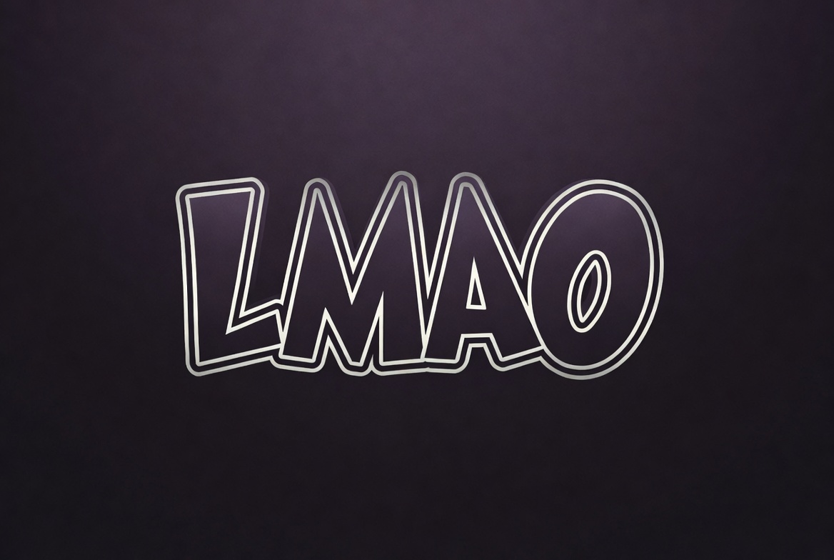 acronym, black background, bold letters, clipart, dark background, digital art, funny text, glowing text, graphic, humor, illustration, internet slang, laughing my ass off, meme text, neon text, purple background, signage, white outline, LMAO