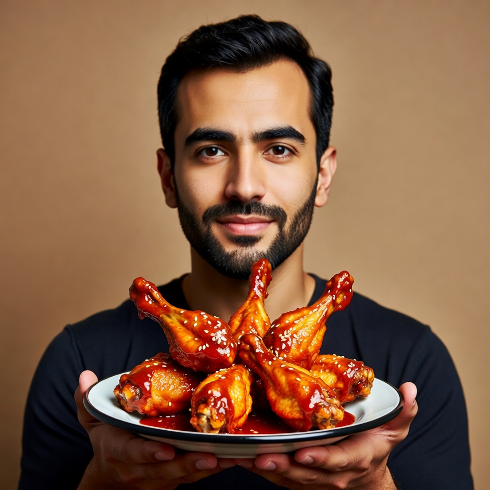 A Middle Eastern man with dark hair and a beard smiles while holding a white plate of glossy red-sauced chicken wings in front of him. He wears a black shirt against a beige background. The chicken wings are arranged in a star shape on the plate.
