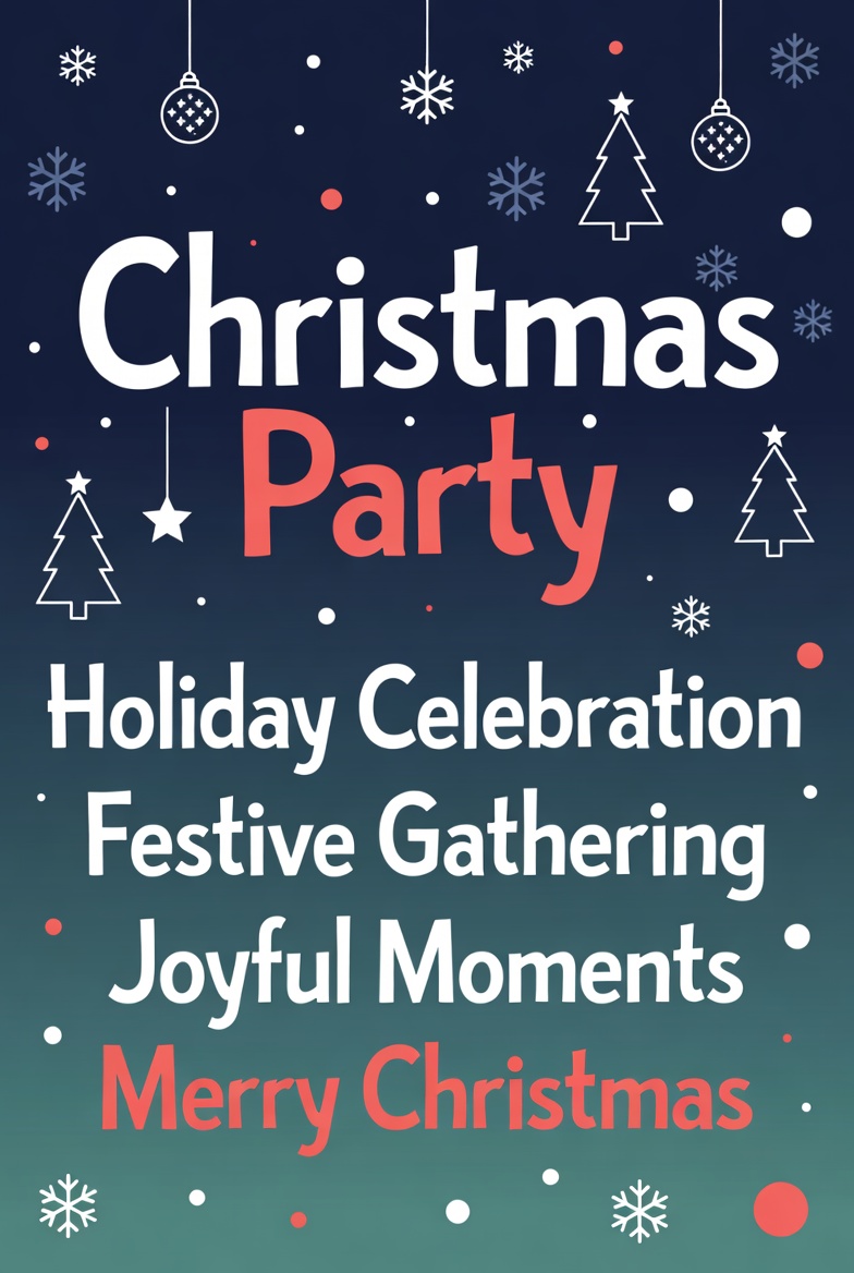 A festive Christmas party invitation poster features bold red and white text saying 'Christmas Party' on a dark blue background with snowflakes. White outline Christmas trees, hanging ornaments, and stars decorate the design. Additional text includes 'Holiday Celebration', 'Festive Gathering', 'Joyful Moments', and 'Merry Christmas'.